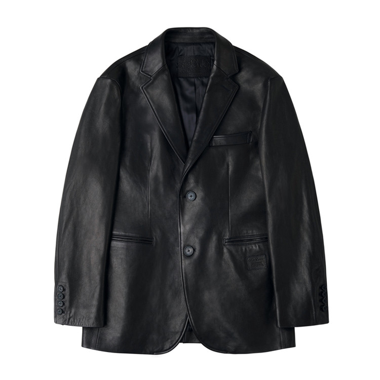 This single blazer typed leather jacket is designed with two buttons, notch lapels, Barca pockets, flap pockets and double vent. It also has original buffalo buttons, armpit sweat patches and saddle stitch finish.