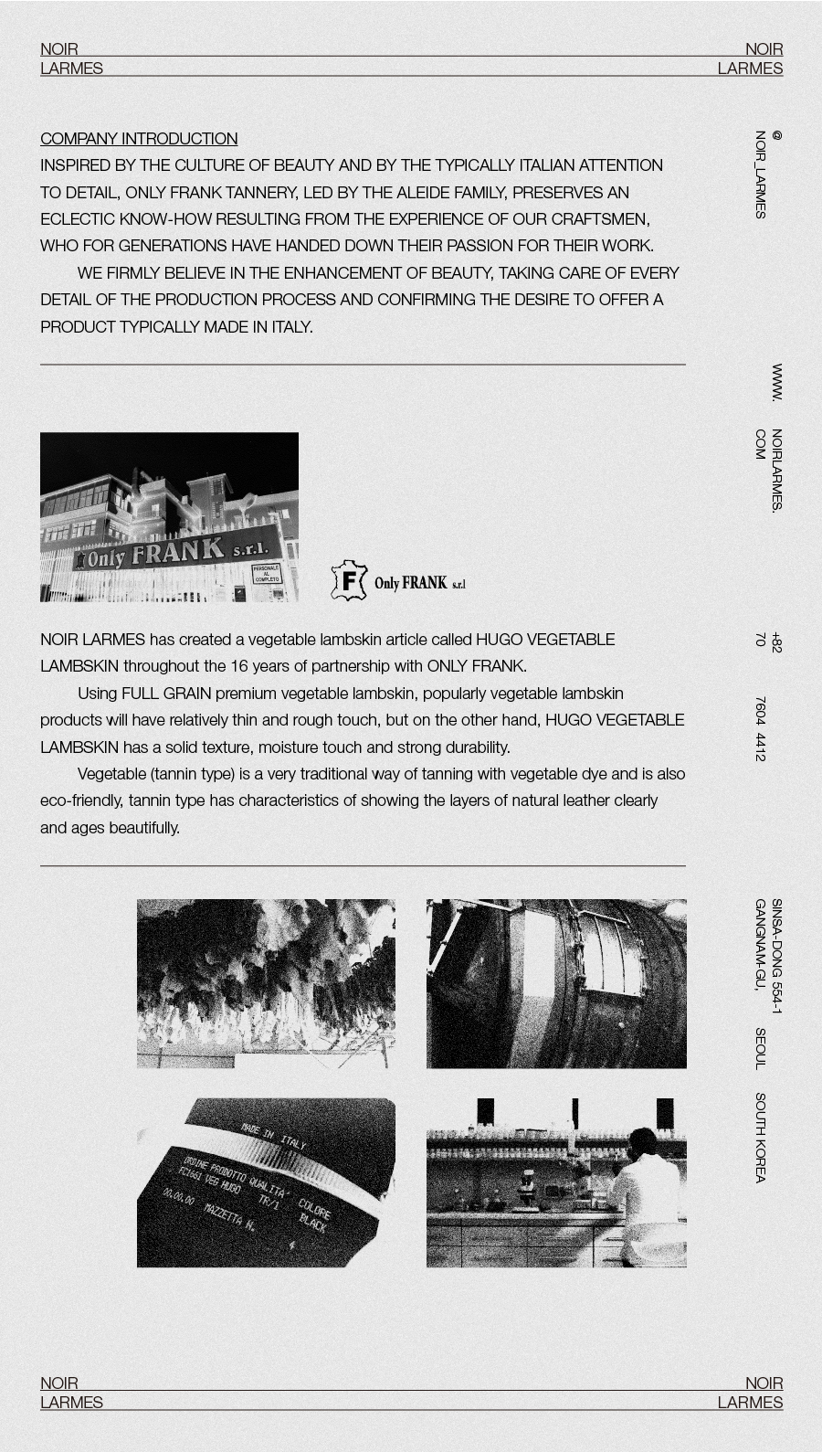 NOIR LARMES has created a vegetable lambskin article called HUGO VEGETABLE LAMBSKIN throughout the 16 years of partnership with ONLY FRANK.