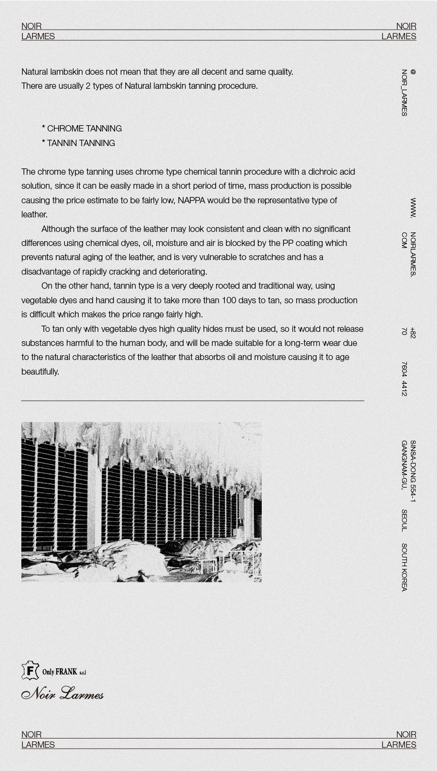 NOIR LARMES collaborated with Italian tannery Only Frank to create a distress effect based on vegetable tanning using eco-friendly raw materials, characteristic of Asportato Full Grain Vegetable Lambskin is that it has excellent quality and non-artificial roughness compared to Asportato Lambskin which is tanned with chrome (chemical dye).