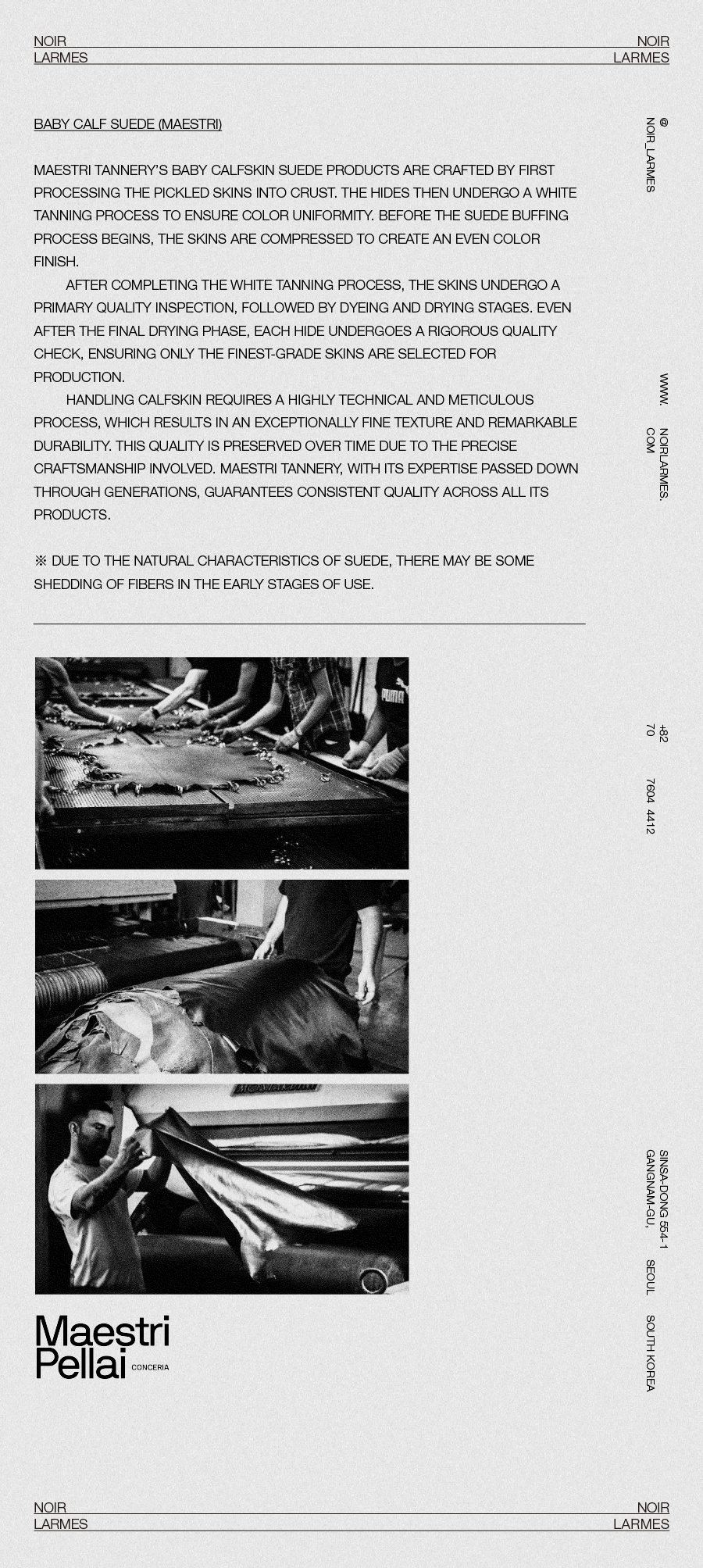 Handling calfskin requires a highly technical and meticulous process, which results in an exceptionally fine texture and remarkable durability. This quality is preserved over time due to the precise craftsmanship involved. MAESTRI Tannery, with its expertise passed down through generations, guarantees consistent quality across all its products.