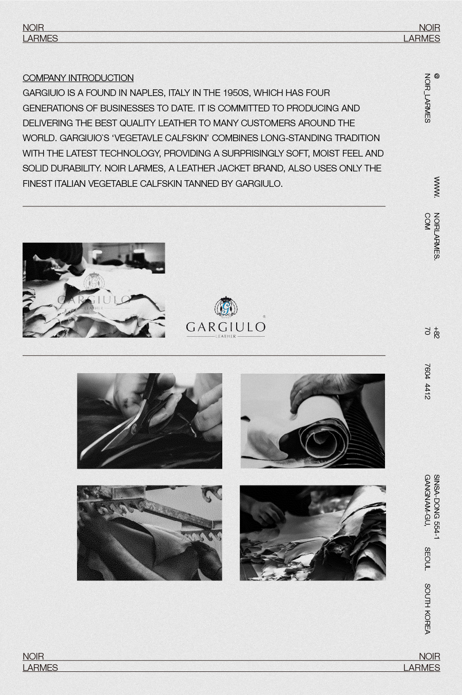 Gargiulo is a tannery found in Naples, Italy in the 1950s, which has run four generations of businesses to date. It is committed to producing and delivering the best quality leather to many customers around the world. Gargiulo's "Vegetable Calfskin" combines long-standing tradition with the latest technology, providing a surprisingly soft, moist feel and solid durability. Noir Larmes, a leather jacket brand, also uses only the finest Italian vegetable Baby calfskin tanned by Gargiulo.