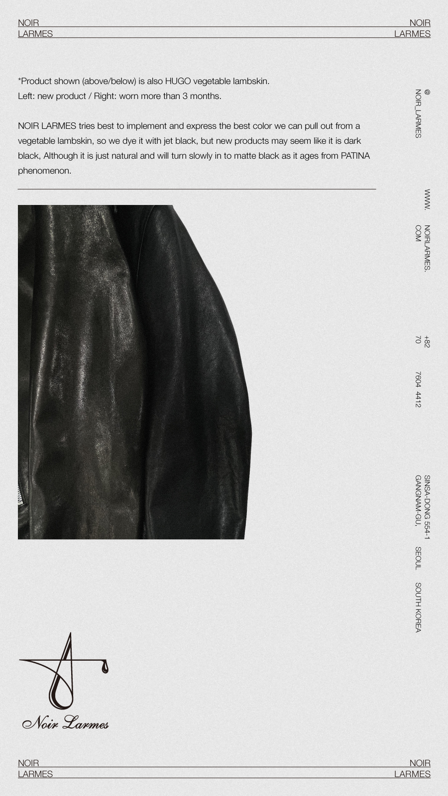 *NOIR LARMES tries best to implement and express the best color we can pull out from a vegetable lambskin, so we dye it with jet black, but new products may seem like it is dark black, Although it is just natural and will turn slowly in to matt black as it ages from PATINA phenomenon.